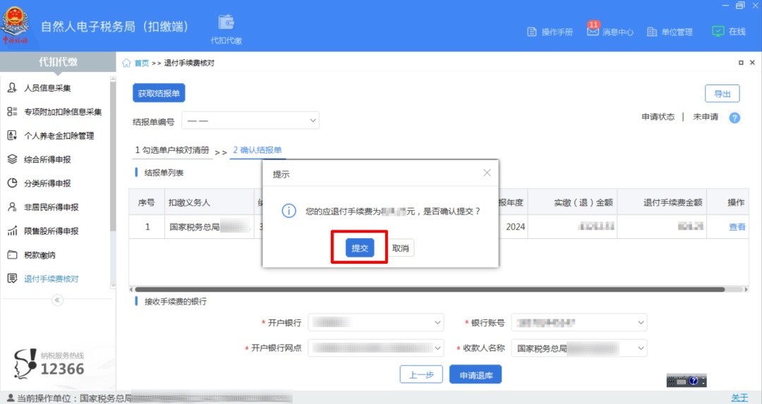 五、系统弹出提示框,点击【提交】。完成后系统将推送至税务机关及国库审核,审核通过后,申请的手续费将退到扣缴义务人办理退付手续费时选择的银行账户内。